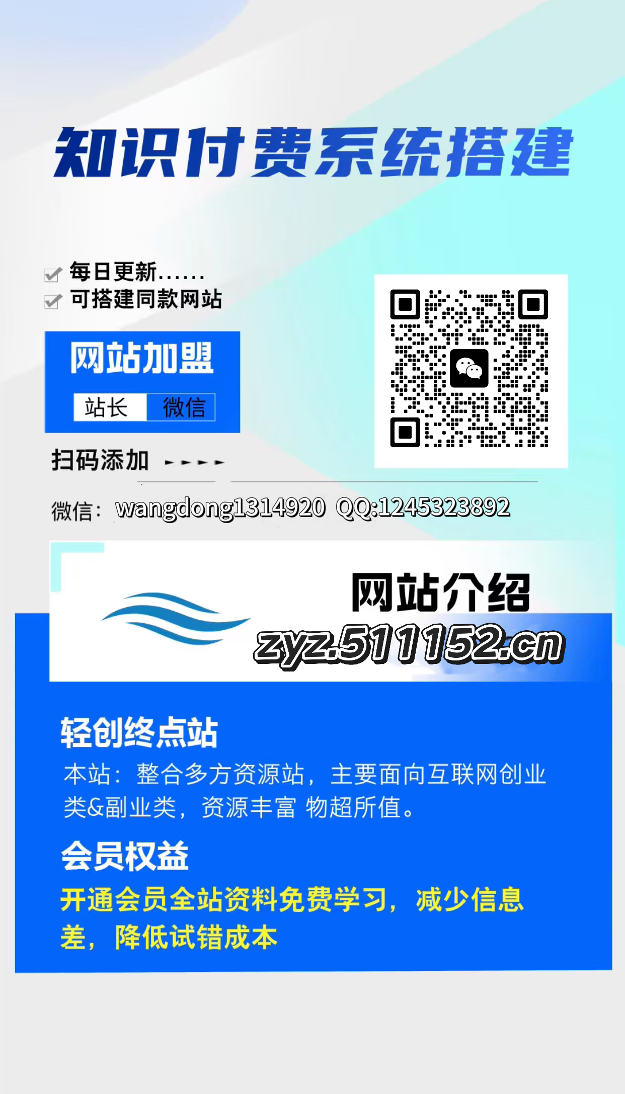 加盟轻创终点站,加盟搭建同款知识付费资源网站,实现长期稳定被动收入~
